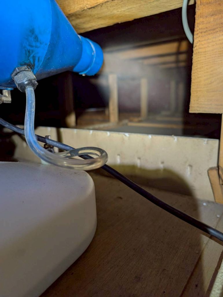 以前から屋根裏で激しい足音がしていたのですが、最近は音がしなくなったとのことで工事に入りましたが、当日念のために追い出しの薬剤を入れてみると、ハクビシンの子供の鳴き声が…