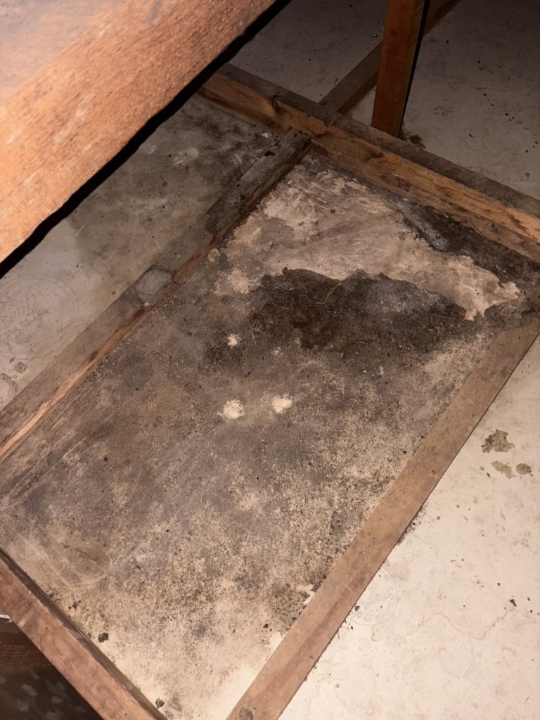 工事当日は屋根裏に潜り、糞尿の清掃と、薬剤を使用して消臭を徹底的に行いました。