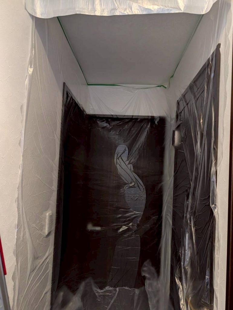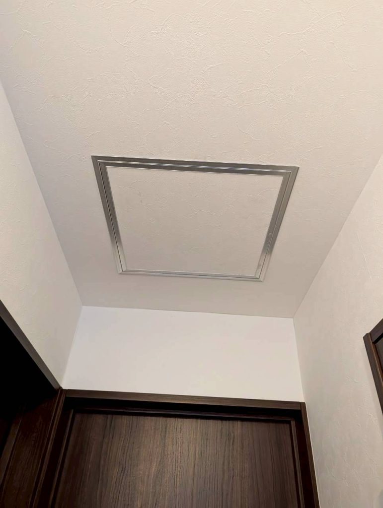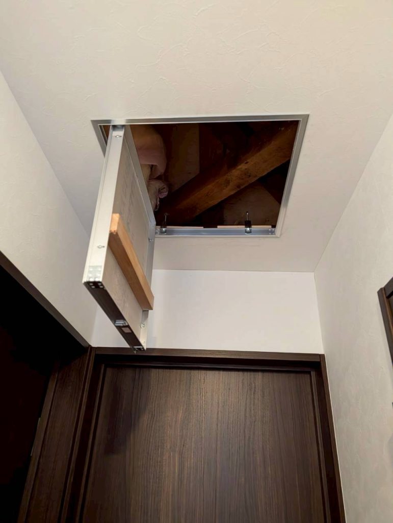 その後、薬剤の散布を行いますが、天井裏を覗ける箇所がございませんでしたので、弊社にて開口工事を行い、そこから薬剤の散布を行っております。